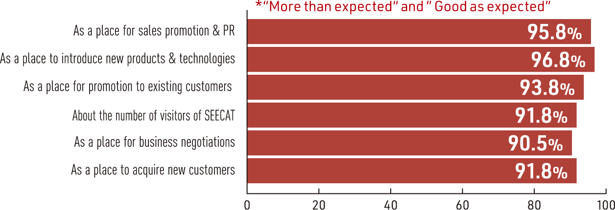 About 90% of exhibitors answered that the results of the exhibition “exceeded their expectations or met their expectations.” The high quality of business negotiations and information exchange was evident in the comments such as, “We were able to secure many deals that led to business negotiations and contracts,” and “Many visitors had issues to be addressed.” Many exhibitors found the exhibition to be very rewarding, and the exhibition has earned a positive reputation as a venue for business negotiations, PR and marketing that can produce excellent results.
